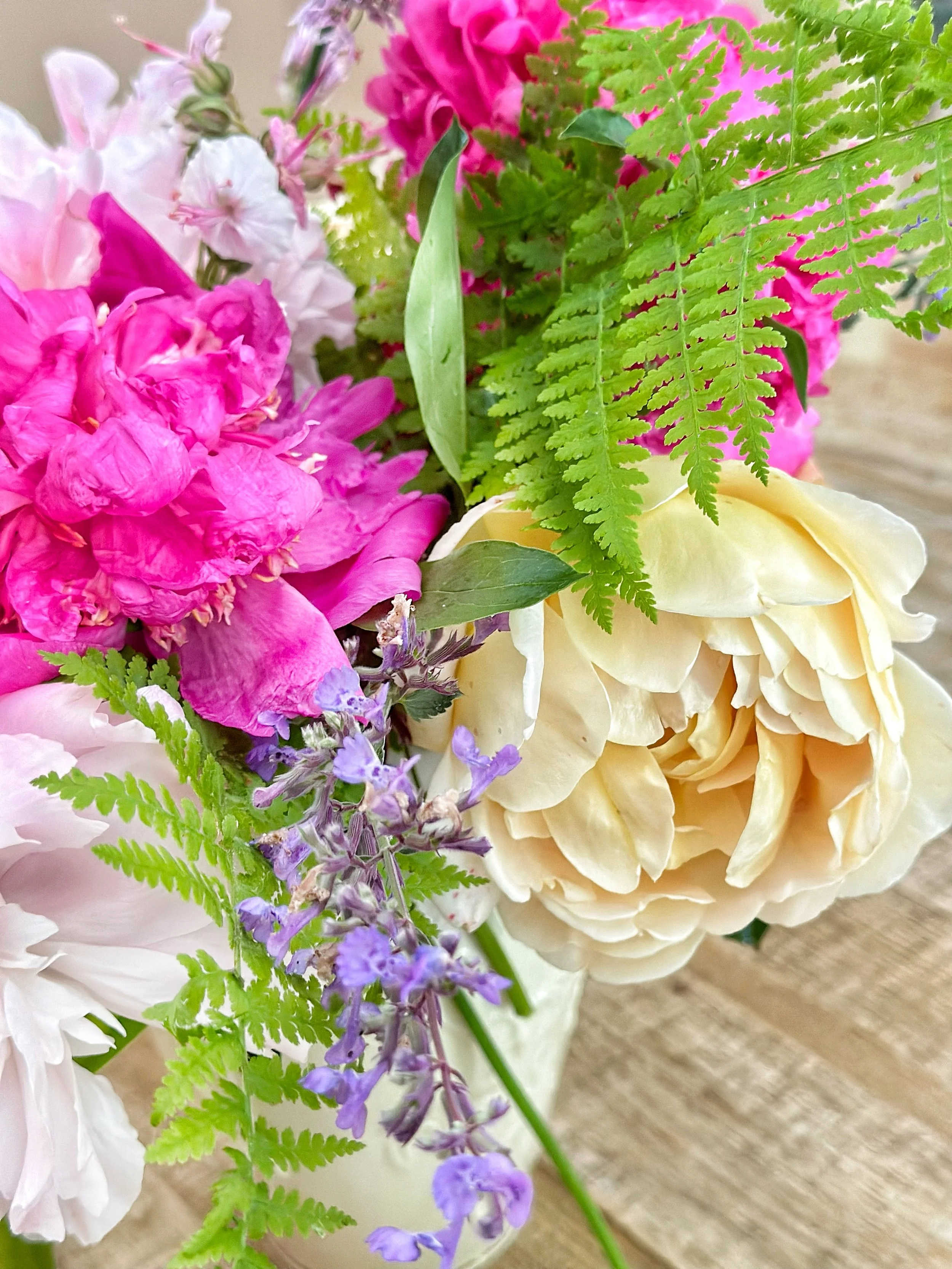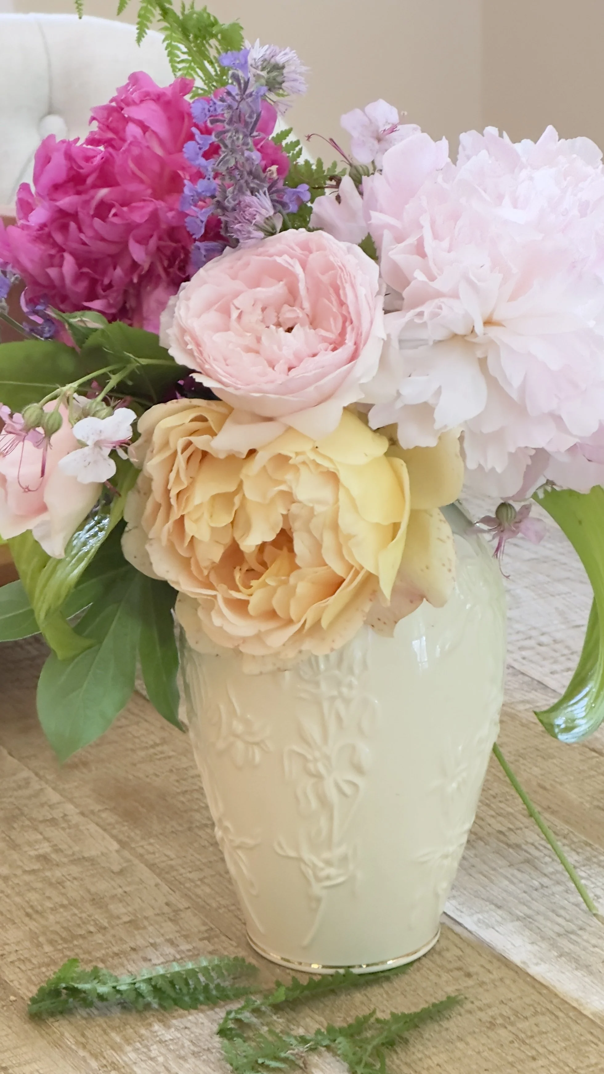 Back inside, I arranged my floral treasures in a vase. The mix of yellow and pink roses with dark and light pink peonies looked exquisite against the deep green of the ferns and hosta leaves. The purple and pink flowers tucked in among the larger blooms added charm to the bouquet.
