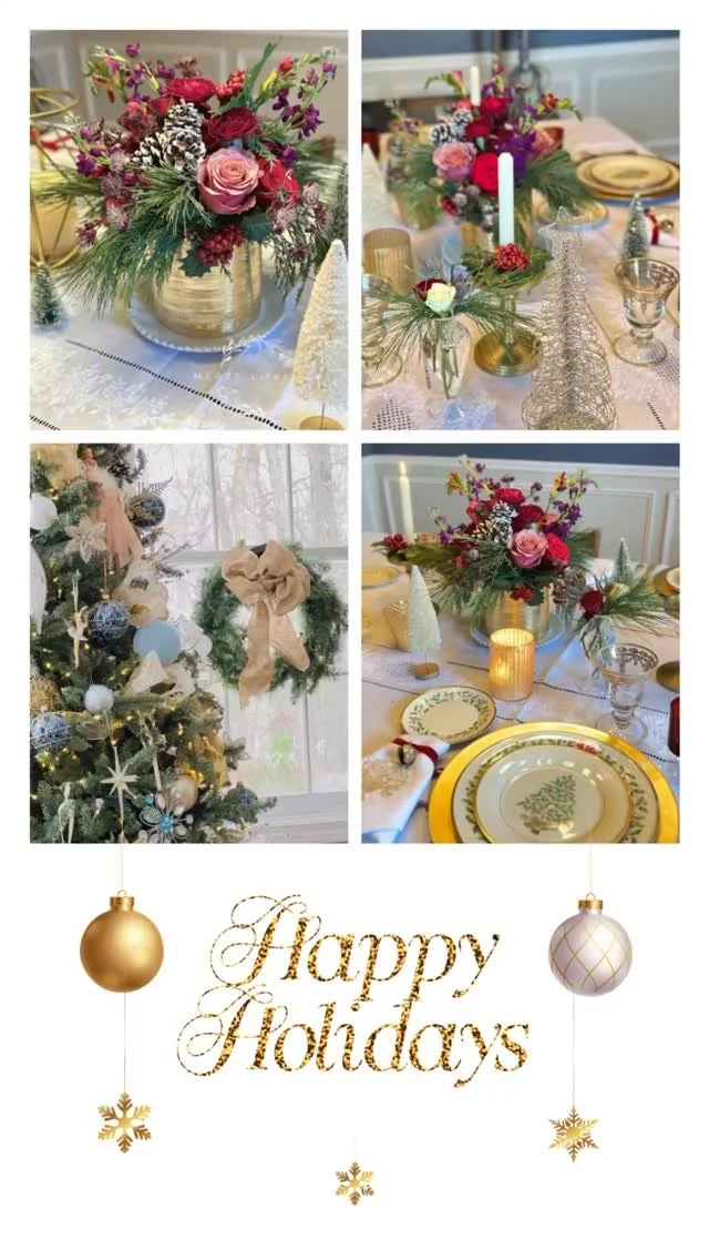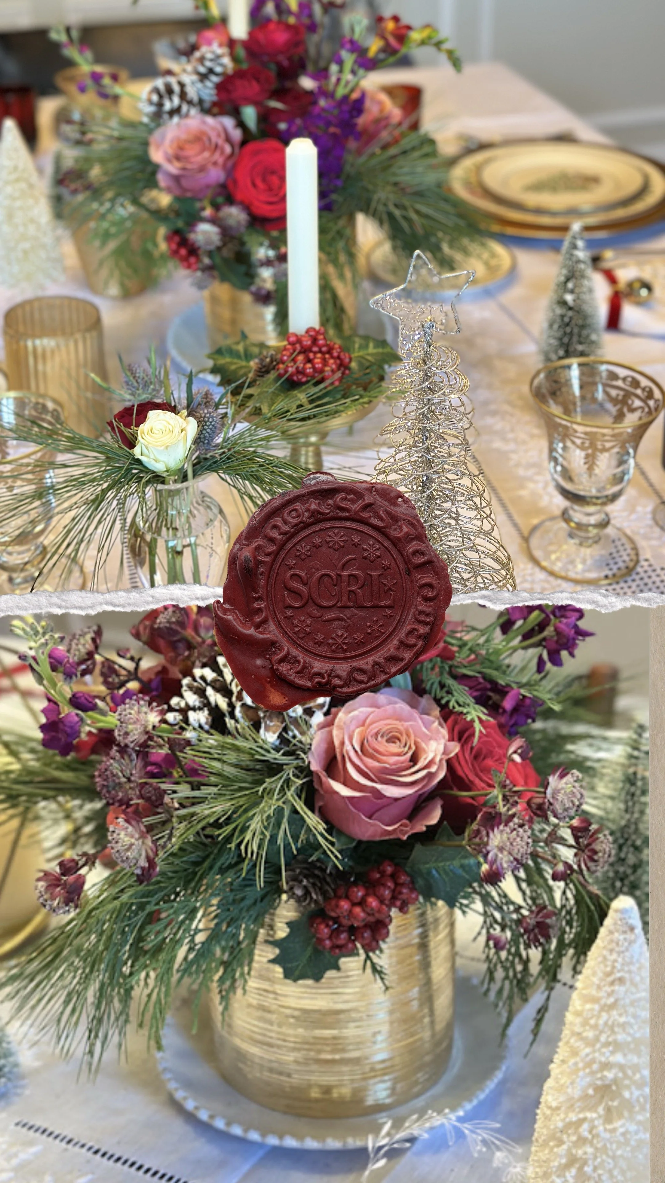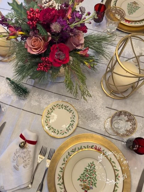 The centerpiece was created with the table in mind, not added afterward. I looked at the colors and finishes already present and allowed them to guide the arrangement. Red and pink roses bring warmth, winter berries add festive texture, and evergreens ground the composition in the season.