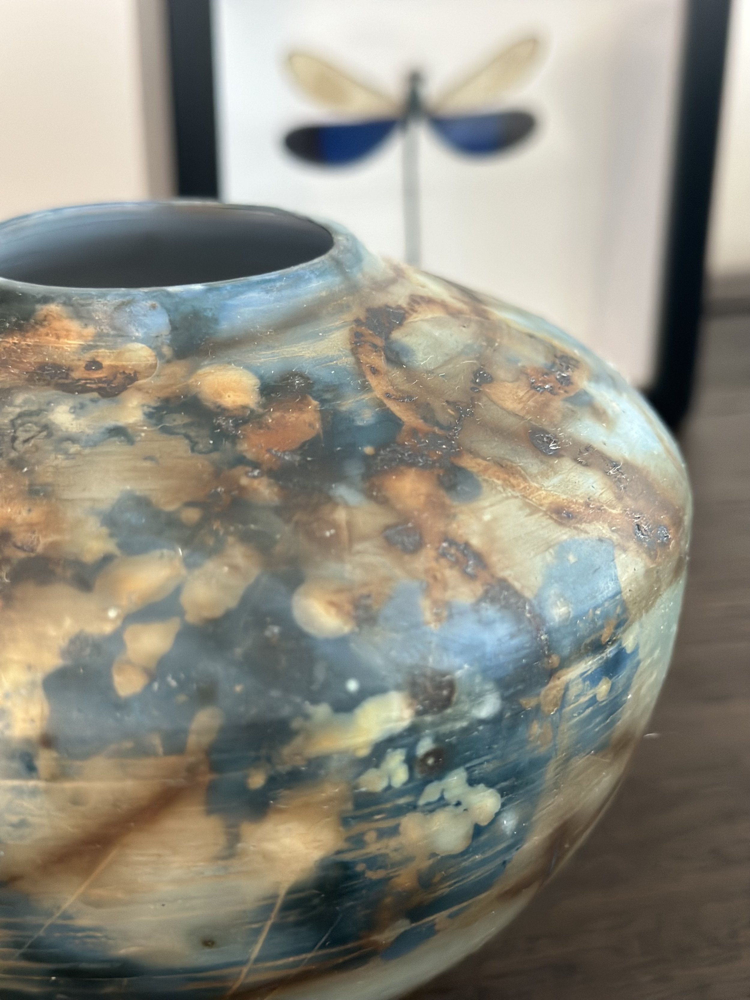 Another beautiful piece of pottery, this one adorned with the colors of the Pacific Ocean. The dragonfly in the background nods to my company's logo and brings back memories of my trips worldwide. I bought this lovely piece in Australia.