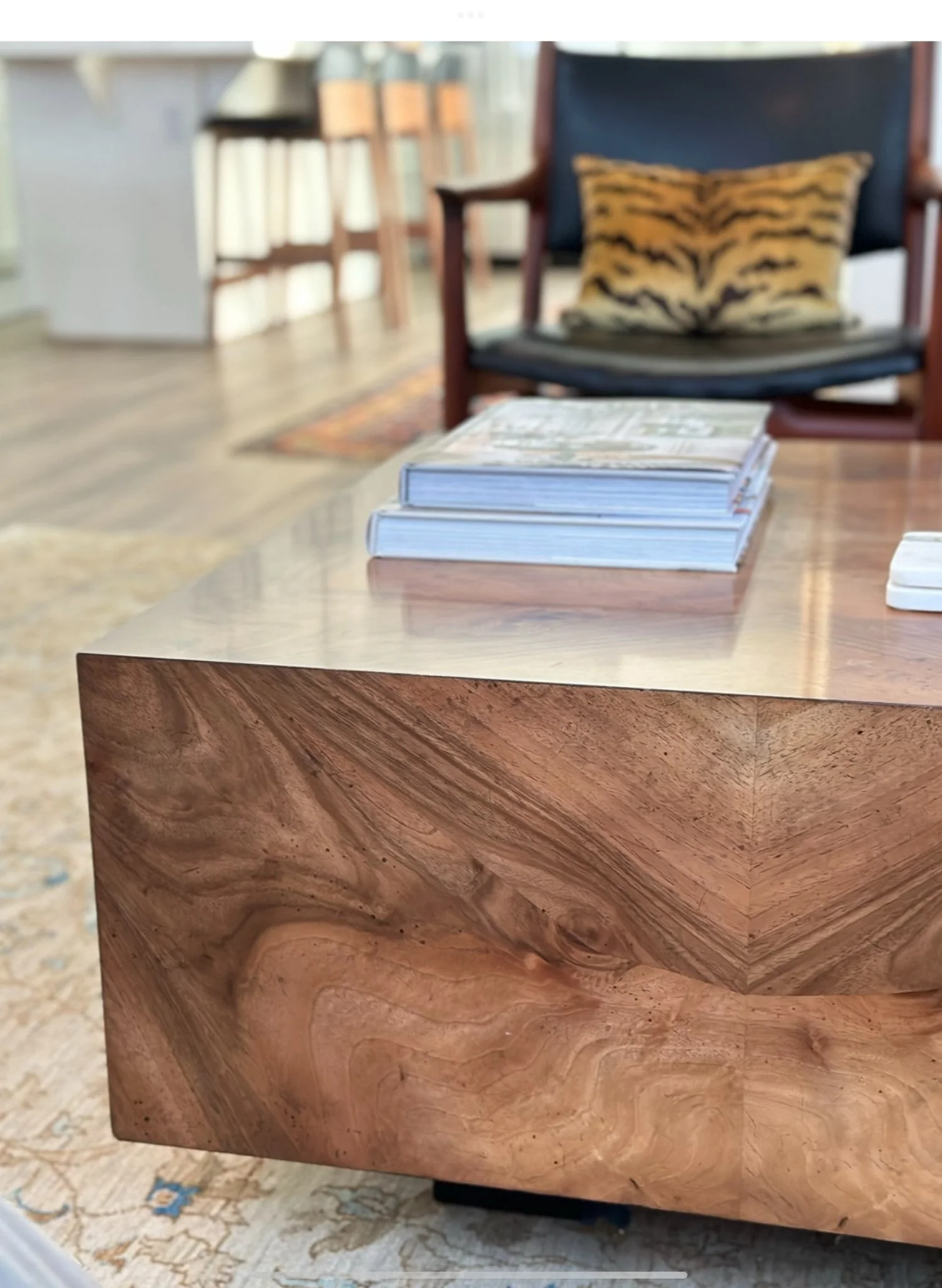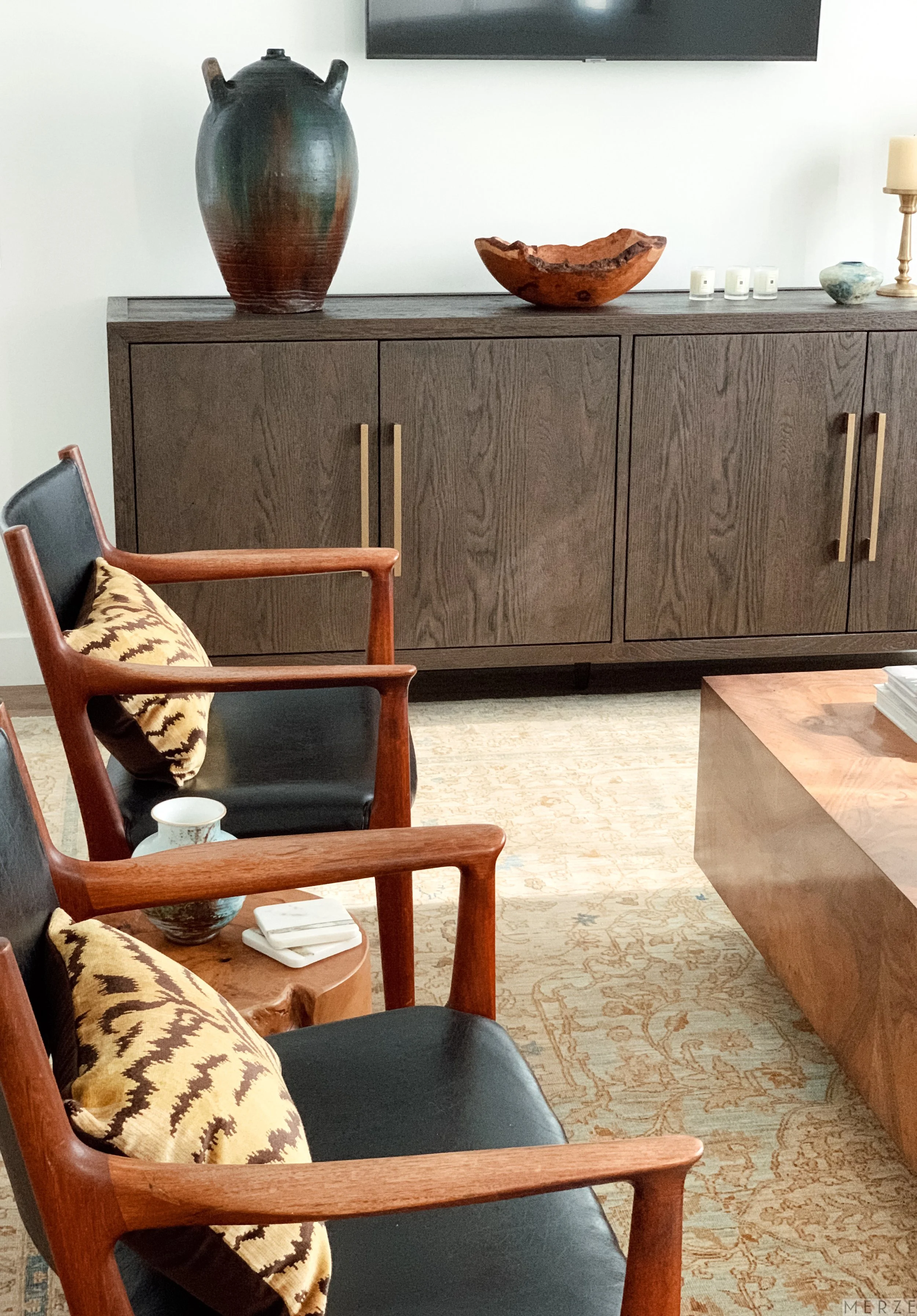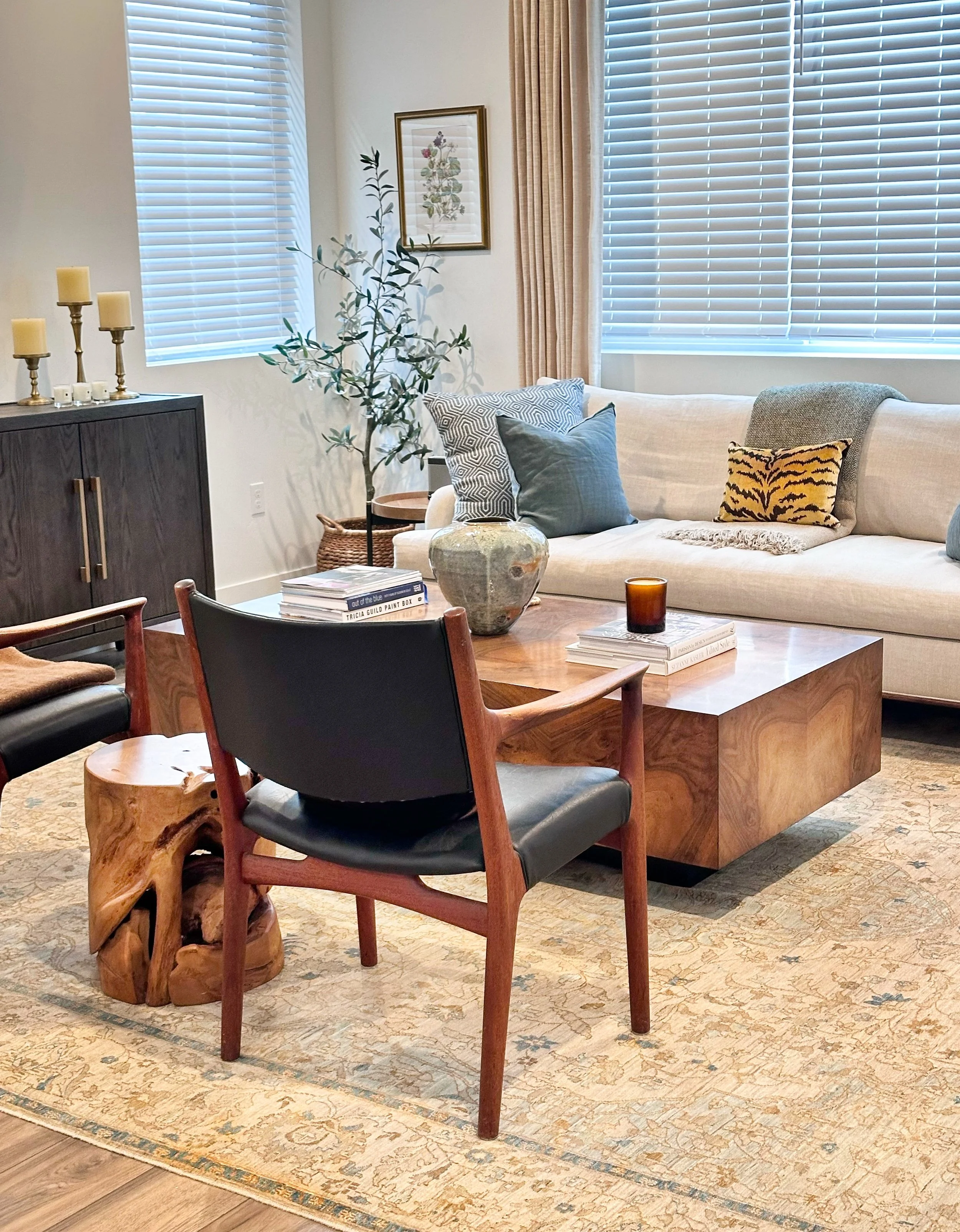 I’ve always believed that nature should play a role in interior design. It’s not just about aesthetics—it’s about bringing the peace of the outdoors inside. I’ve incorporated organic elements like a round tree stump side table and a hand-carved cherry wood bowl, both of which reflect the rugged beauty of the coastline. A beautifully wood-grained walnut-floating coffee table is the centerpiece, seamlessly anchoring these elements and creating a cohesive design. The olive tree, tucked into a corner, brings a touch of greenery and life to the space, further enhancing the sense of serenity. The leopard throw pillows of deep gold and brown are a beautiful pop of color that I adore, bringing out a more golden hue from the furniture and brass fixtures.