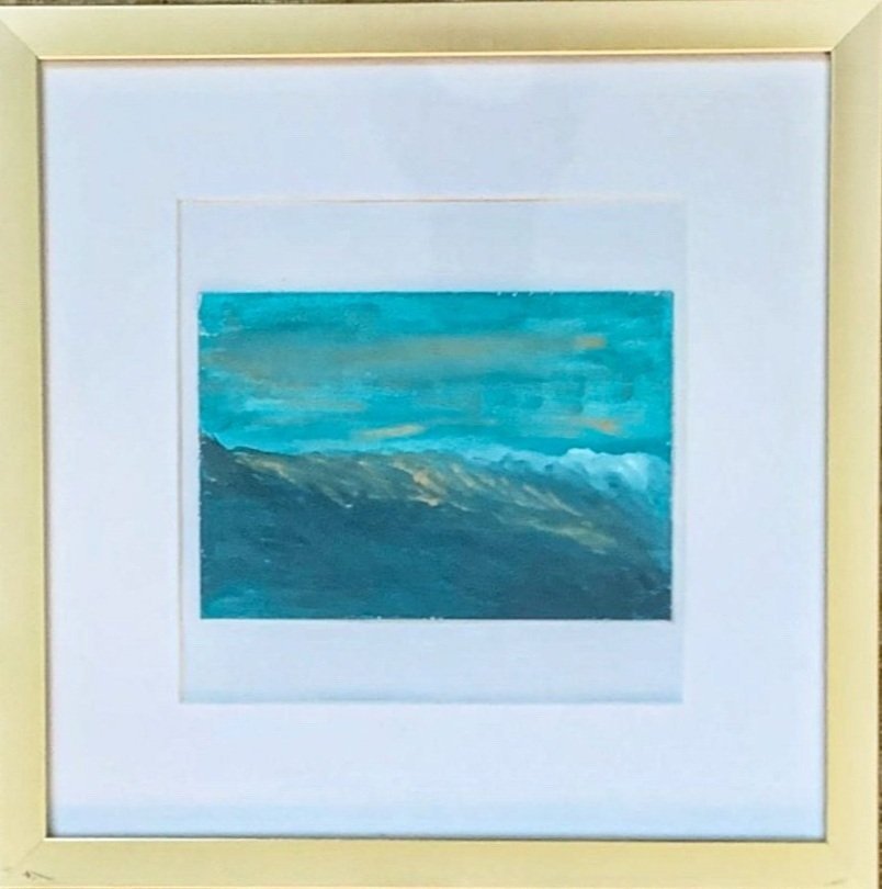 I’ve also painted a few small abstract acrylic pieces that capture the movement of the waves as I see them. The different blends of blues, gold, and whites in these works are drawn from the vibrant colors I experience walking along the shoreline. These paintings are a personal reflection of the ocean’s beauty and the calming moments it offers.