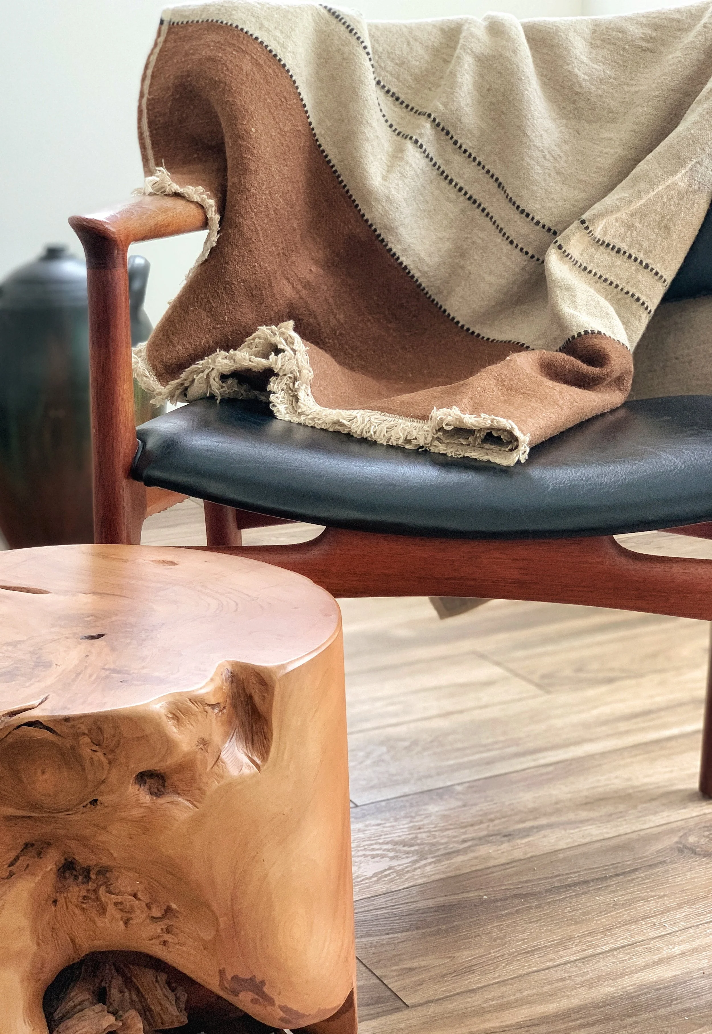The tree stump side table embraces today's circular trends and brings an organic look and feel to the space. Its rich, deep golden color adds more warmth to the room. The 100% organic linen throw is also added for texture and wellness.