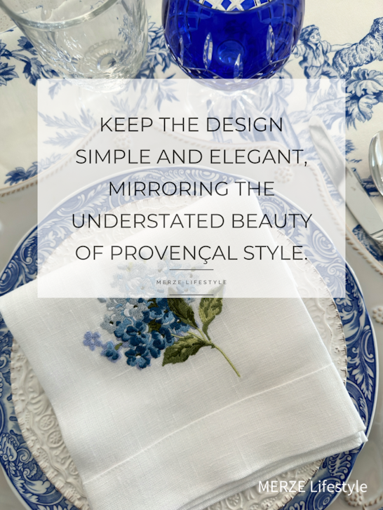 Imagine the blues dancing across your table in the form of hand-painted ceramics or floral linens. Blushes of color might peek through in fresh roses cascading from a centerpiece or delicately embroidered napkins. Together, these hues create a harmonious composition that captures the essence of the French Provincial style, inviting you to linger and savor every moment.