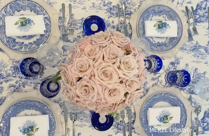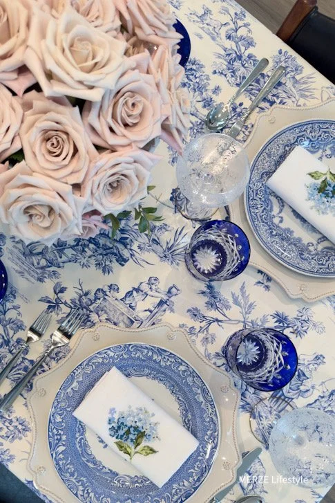 Photo and Design by Merze Lifestyle - I curated the blue and white tablecloth out of this material.