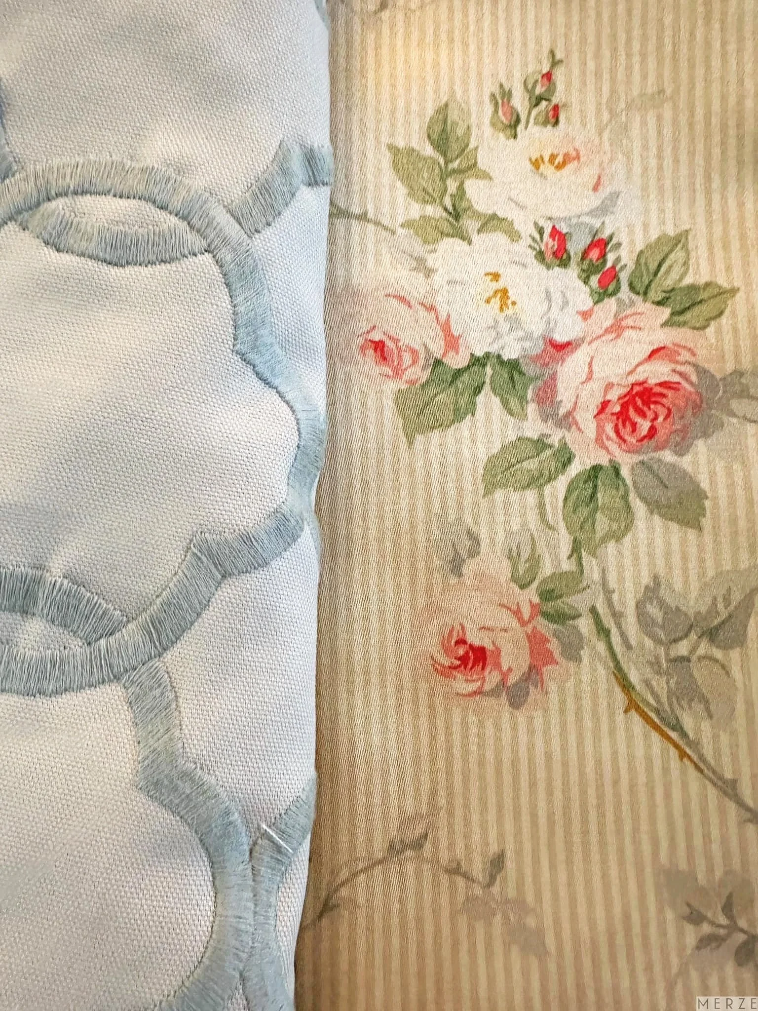When selecting fabrics for throw pillows, I chose a beautiful Ralph Lauren floral fabric with subtle shades of grey and blue, and delightful pops of pink and green. To complement this, I picked another fabric that matches the blue in my carpet and pairs well with the Ralph Lauren fabric. This fabric also has a textured element, bringing in the relaxed, organic vibes of the West Coast. To add even more texture, I backed these pillows with velvet.