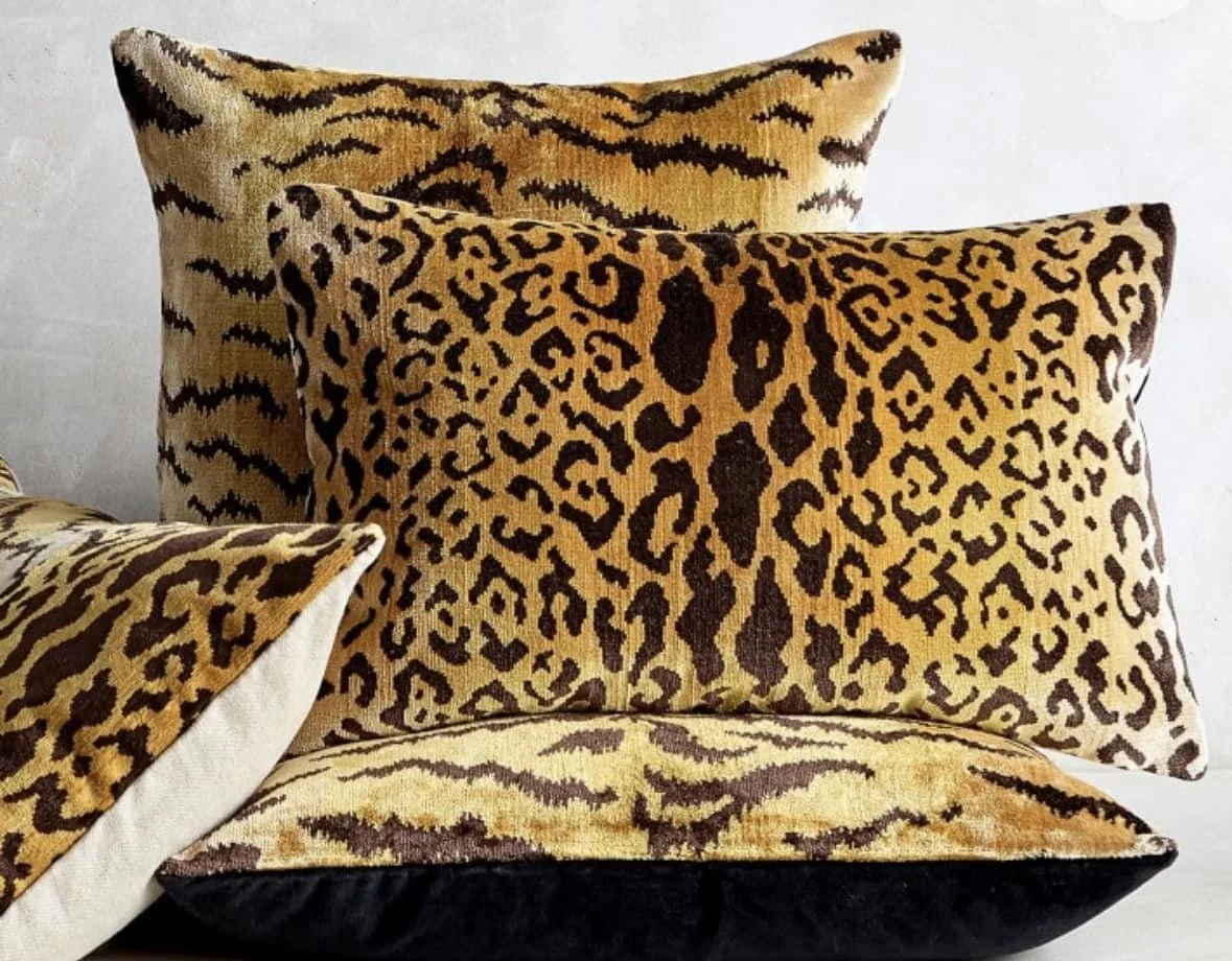 Try using different textures in the fabrics, rugs, and furniture. I added some tiger pillows from Scalamandre along with some texture and heavy woven linen throws . As you can see, I am starting to add color with my textures.