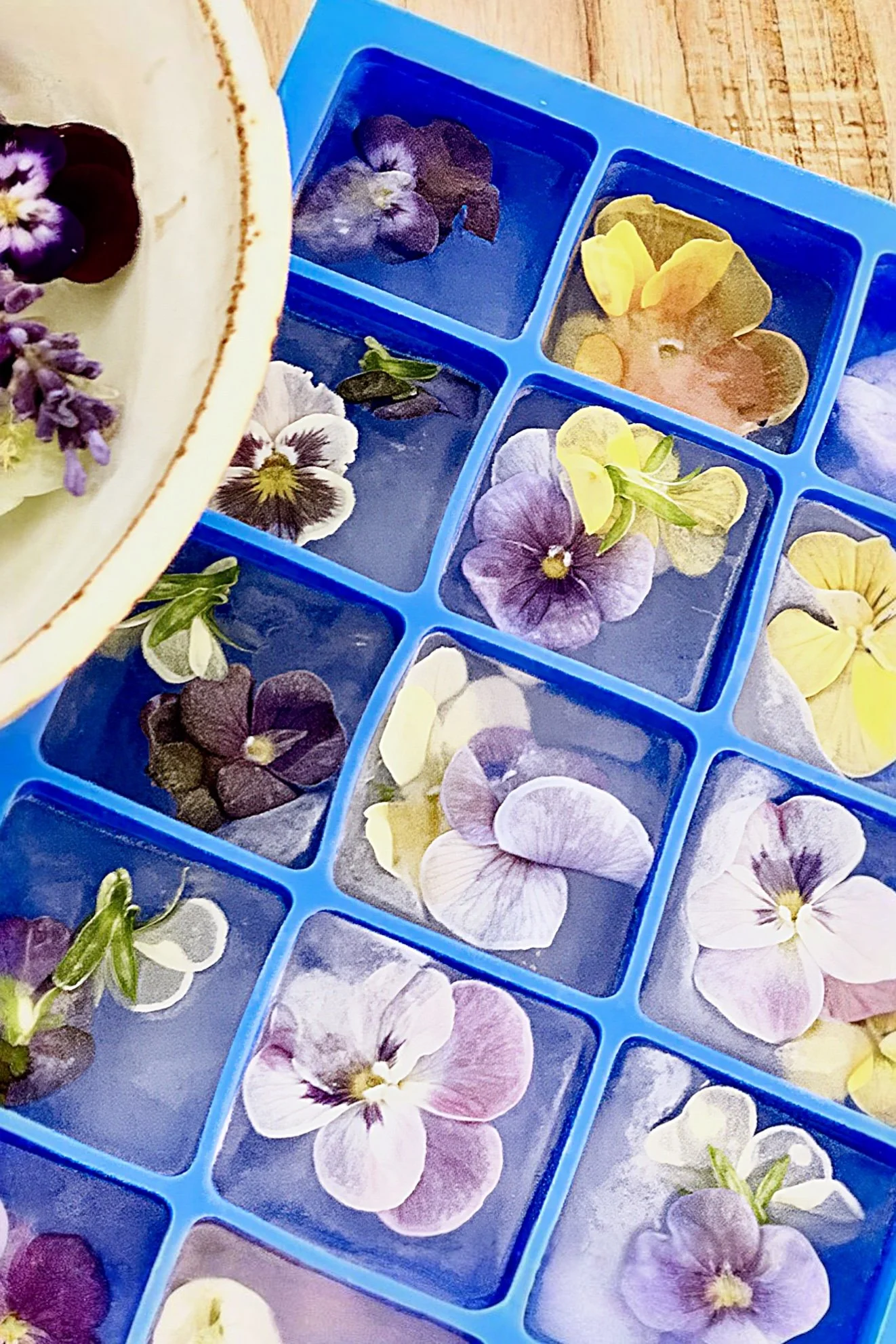 Violas suspended in ice become small botanical details that bring color and beauty to summer drinks.