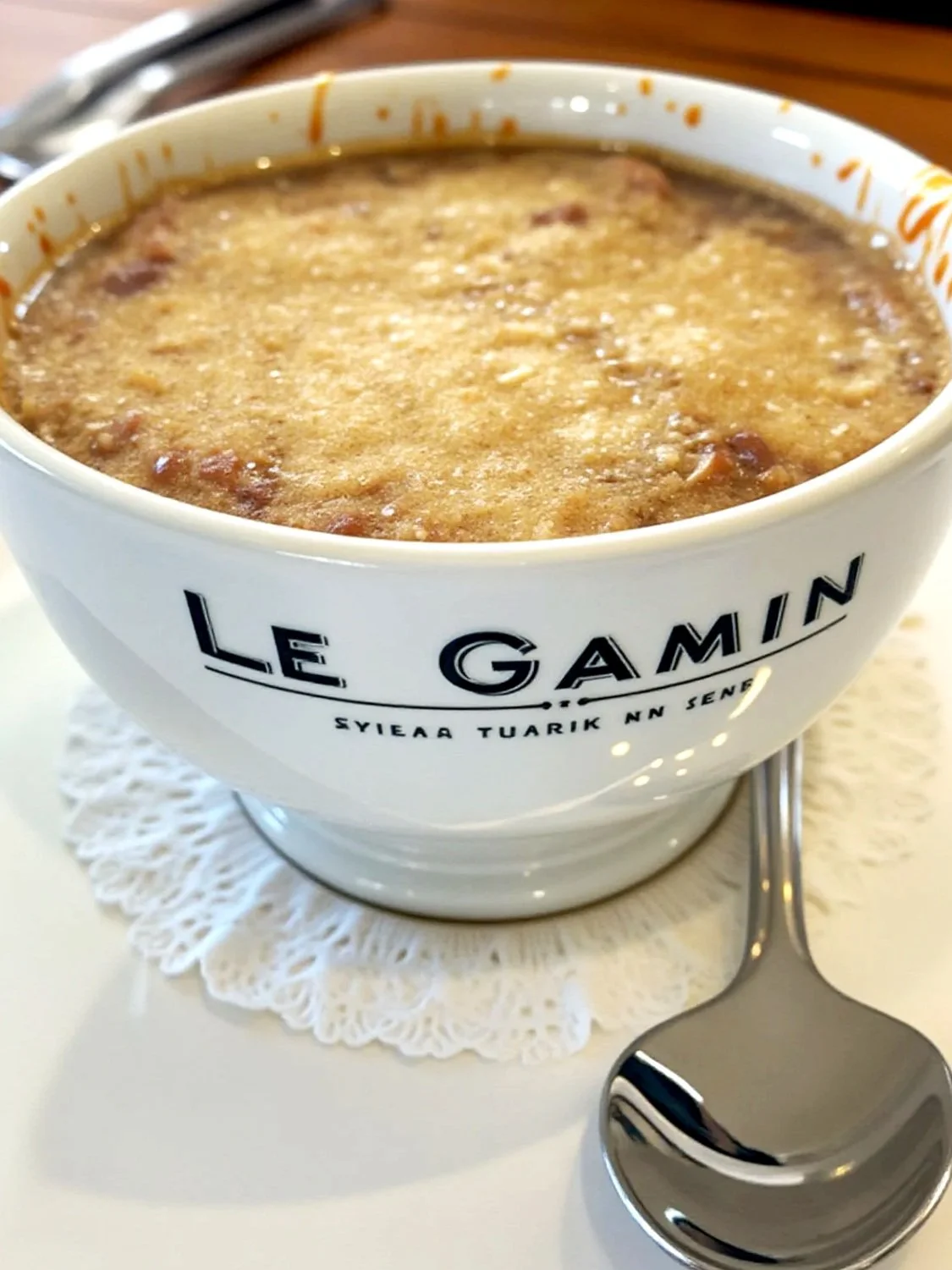 Traditional French onion soup with caramelized onions and melted cheese in a café bowl.