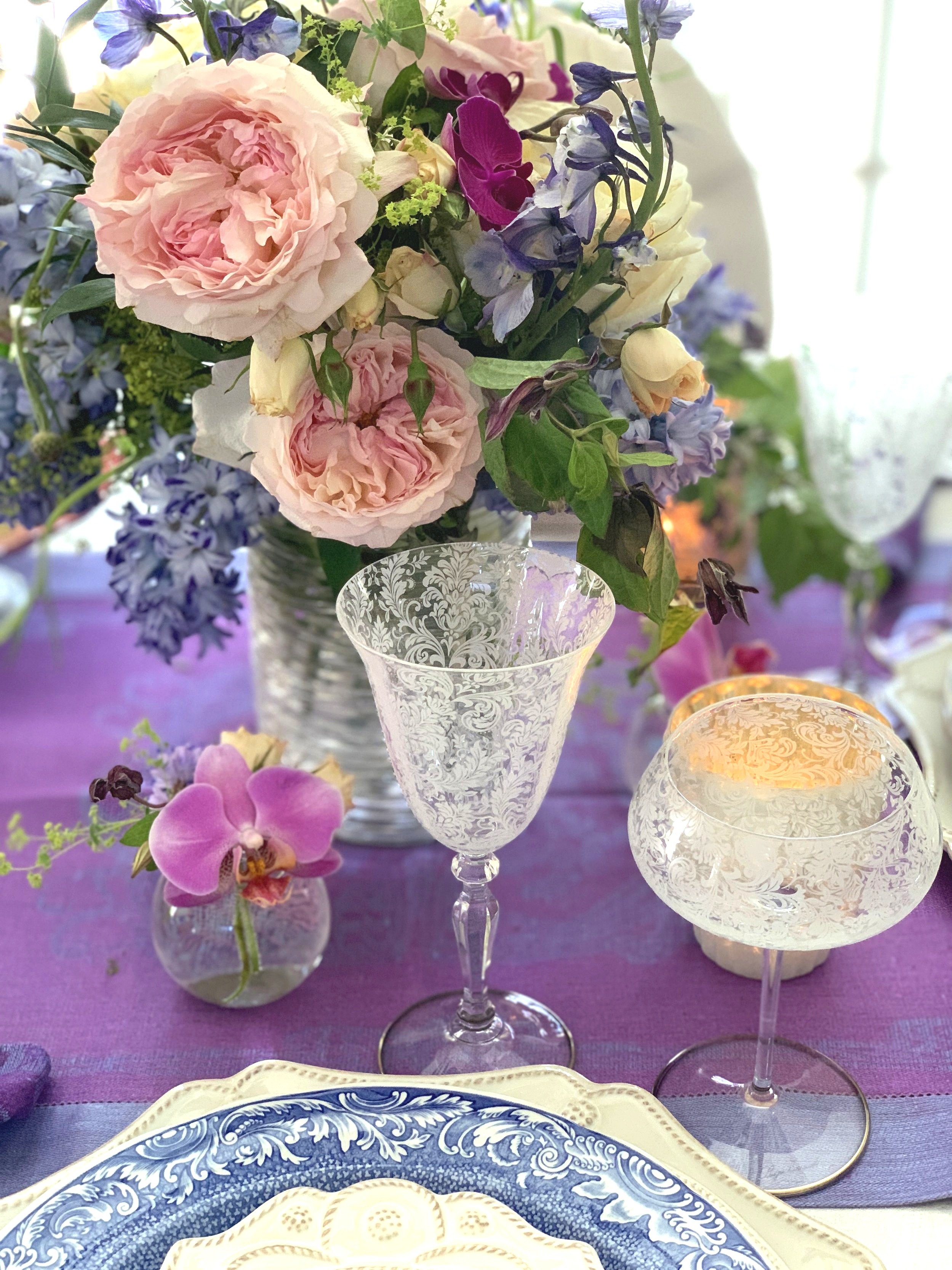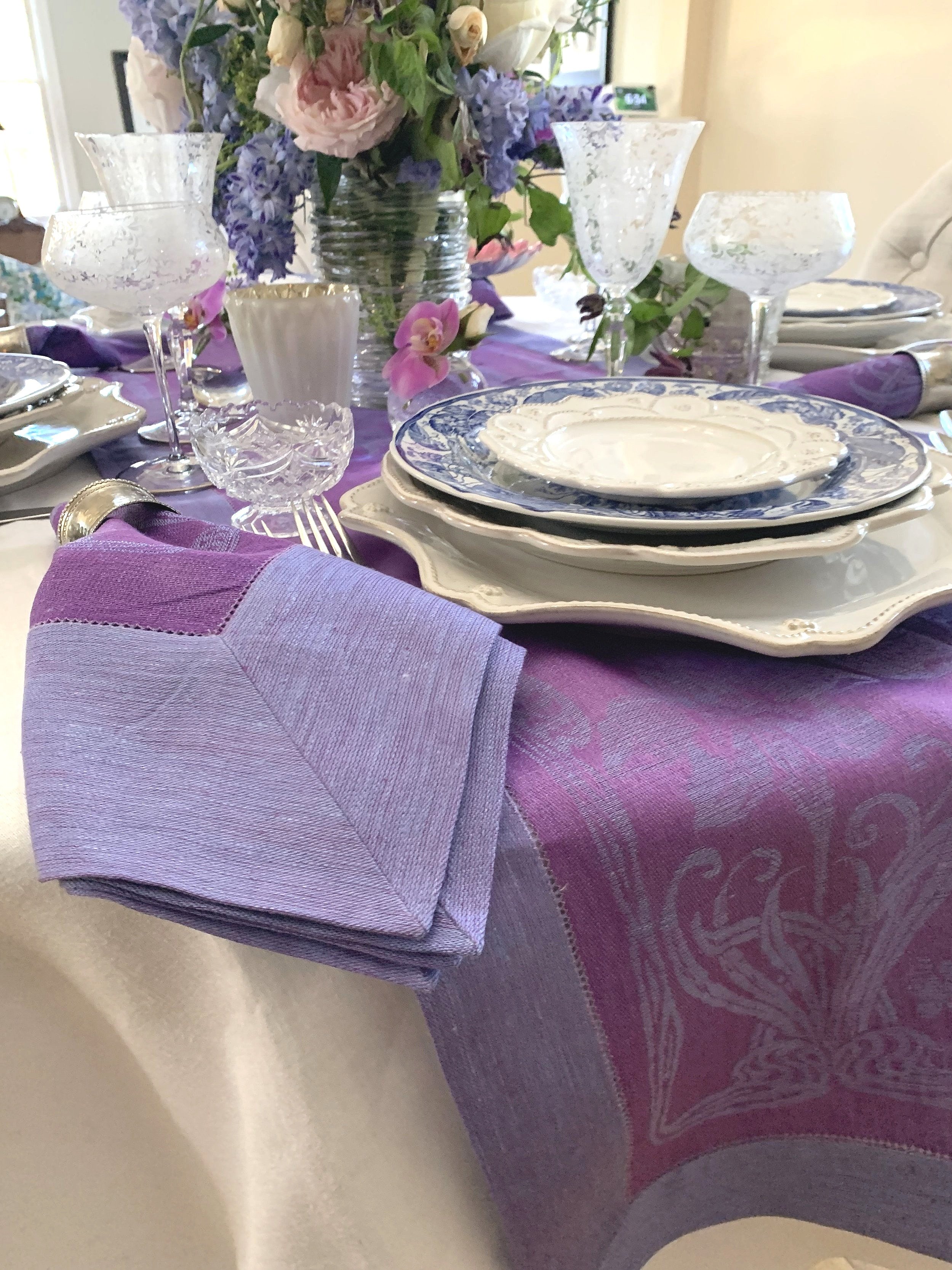 I enhanced my table setup with some delightful design touches to elevate its appeal. The French Jacquard linen runners and napkins I chose boast a stunning pattern with rich colors, adding a touch of elegance to the setting. The texture of the linen is substantial and pleasing to the touch, enhancing the overall tactile experience. These linens beautifully echo the hues of lilacs and purples in the flowers I selected for my centerpiece, creating a cohesive and visually striking presentation. By incorporating these thoughtful details, I've infused my table with charm and personality, making it a delightful focal point for any gathering.