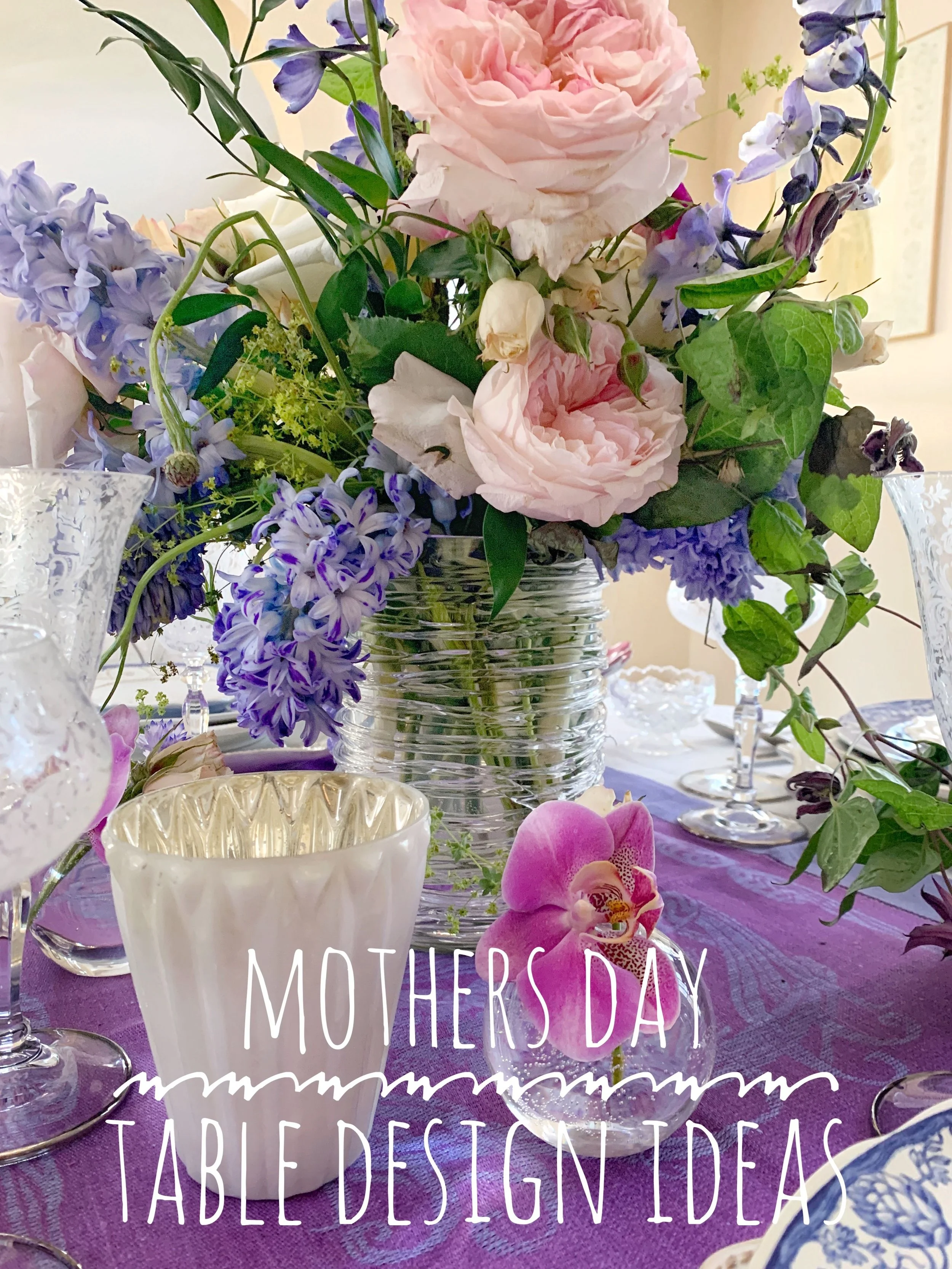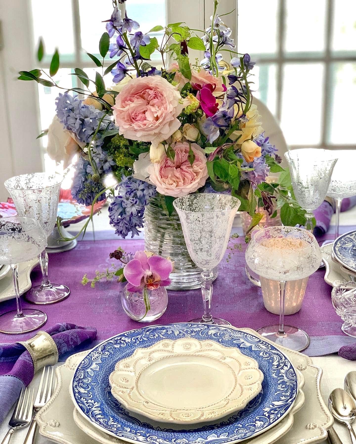This table design features many of the different colors found outside my home. It is filled with shades of purple, pink, blue, and cream. Put together, it is a garden of delight.
