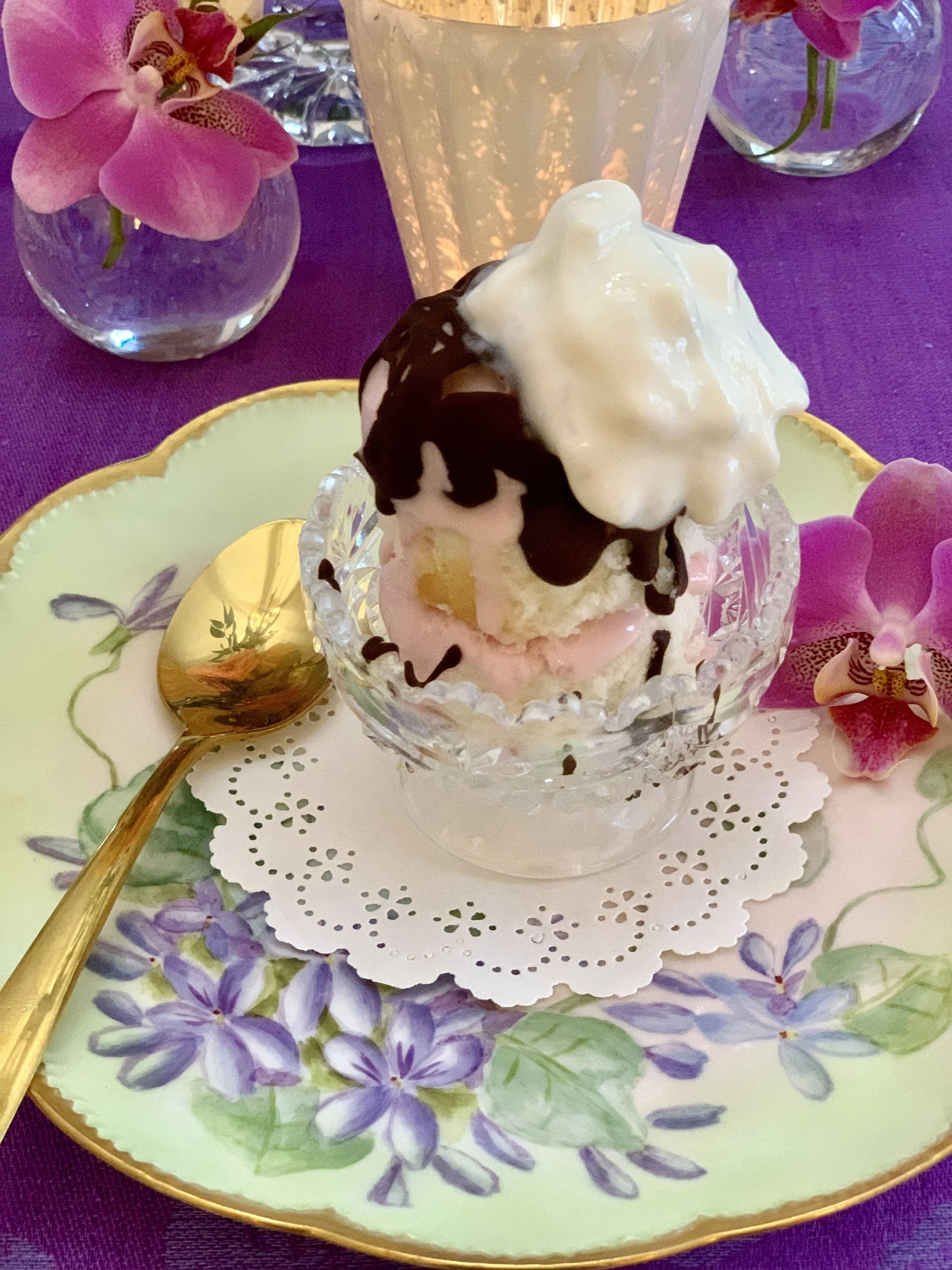 The dessert is layering angel food cake with rose and raspberry ice cream. I drizzled warm chocolate fudge on top and finished with sweet whipped cream. Easy, but the presentation is pretty.
